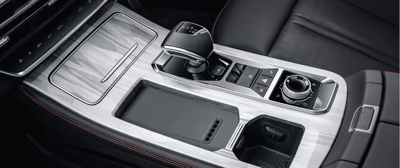 This sleek centre console combined with an ergonomic gear knob also comes with a rotary switch for effortless screen control and a wireless charging dock for your phone.